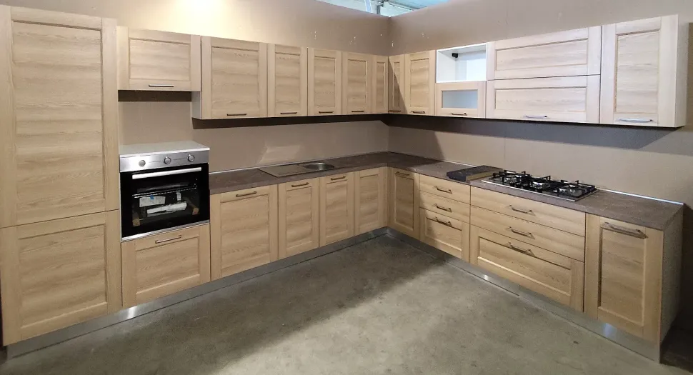 Arrex assicura cucine di qualità elevata, tra cui la cucina Fiorella caramello rovere chiaro ora in offerta.
