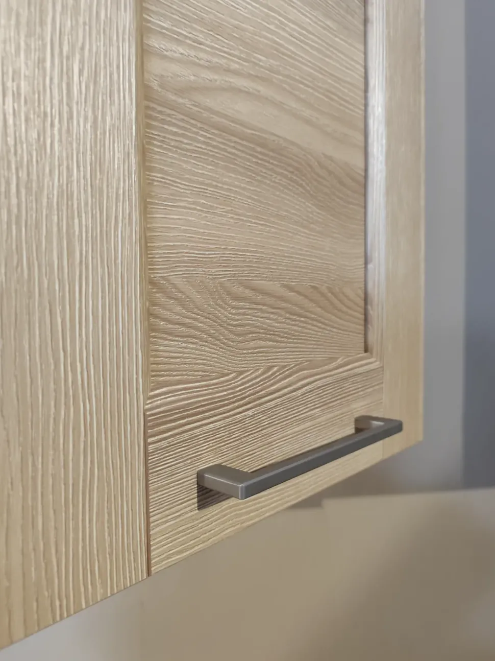 Tutte le ante sono a telaio sp.2.2 cm color caramello e hanno l’ apertura rallentata da cerniere della ditta Blum.