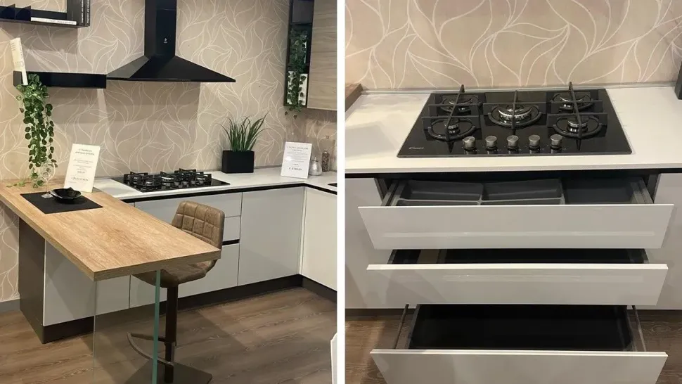 Cucina angolare Delizia firmata Net Cucine in promozione all’interno dello Store di Modugno disponibile nelle finiture grigio lucido e olmo grigio completa di elettrodomestici Candy e penisola in rovere Canyon con gambone in plexiglass.