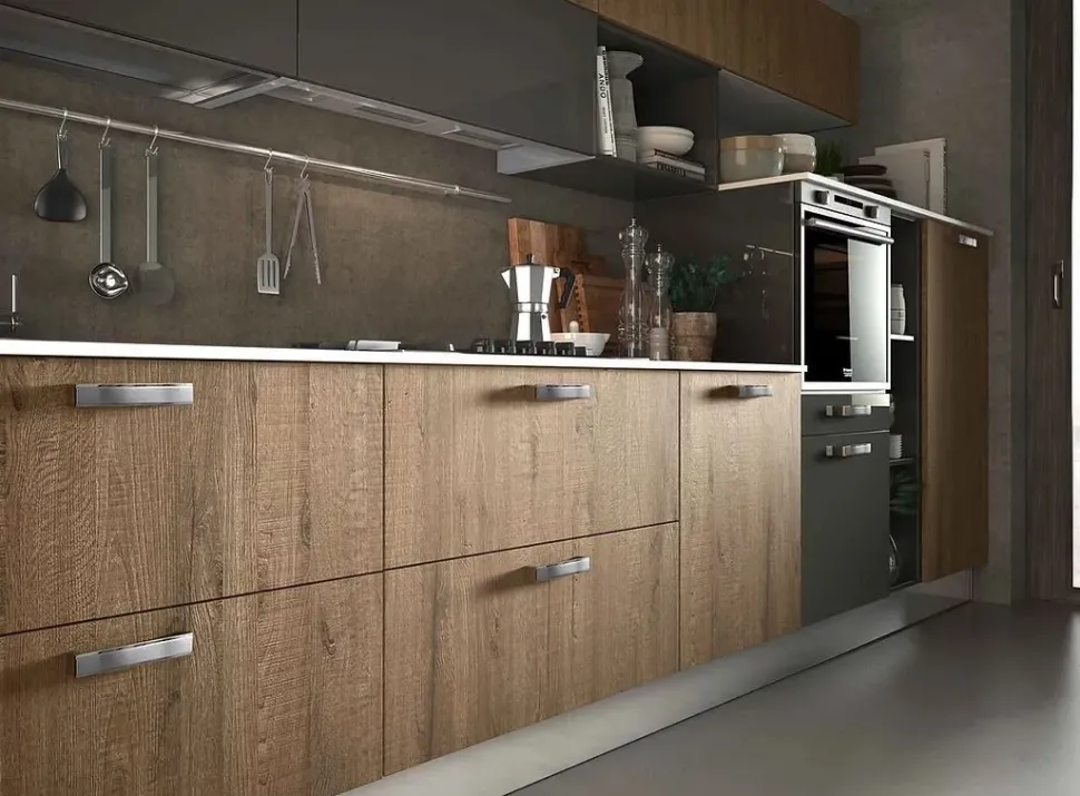 - Non importa se la zona cucina che hai a disposizione è di dimensioni più o meno ridotte, poiché questo modello Modello planet wood lineare potrà trovare posto in locali di svariate forme.