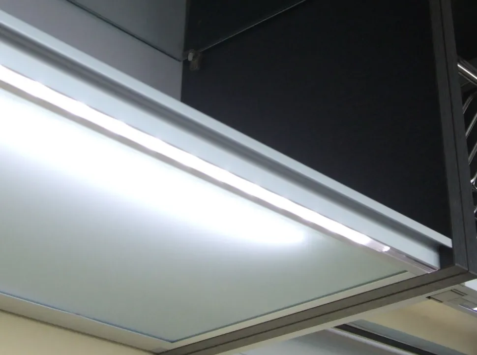 I pensili hanno apertura a ribalta e a vela, con luci a LED per illuminare al meglio il piano di lavoro.