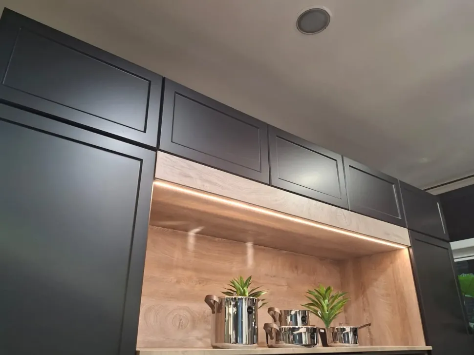 ANTA SP. 22 MM IN PET NERO OPACO A TELAIO CON ELEGANTE MANIGLIA METALLICA. LA PARETE HA LA NICCHIA CON LED INTEGRATO ED E’ ACCESSORIATA CON CANTINETTA, MICRO E FORNO MULTIFUNZIONE, HA DUE COLONNE LATERALI, DI CUI UNA CON FRIGO A SCOMAPRSA E L’ALTRA DISPENSA ED ULTERIORE SPAZIO CONTENITIVO NEI MODULI ALTI SOPRACOLONNE.
