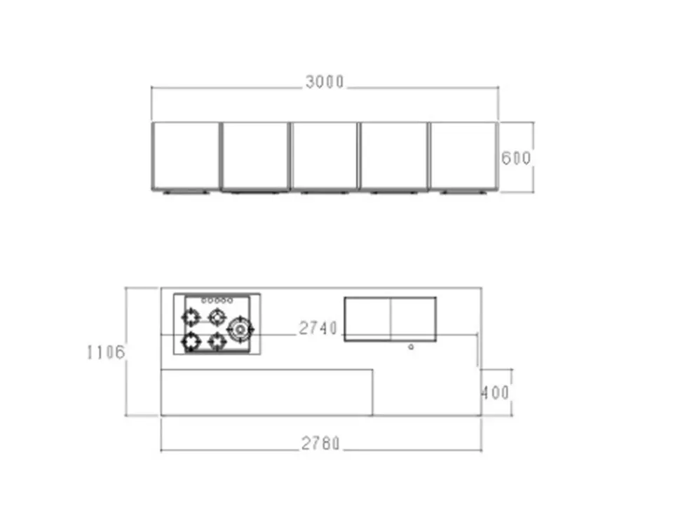 CUCINA LINEARE L.300 CM E ISOLA CENTRALE (L.278 CM x P.110 CM) ACCESSORIATA CON PIANO SNACK RIALZATO.