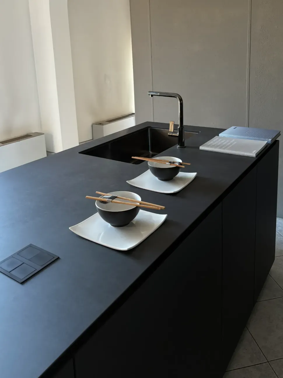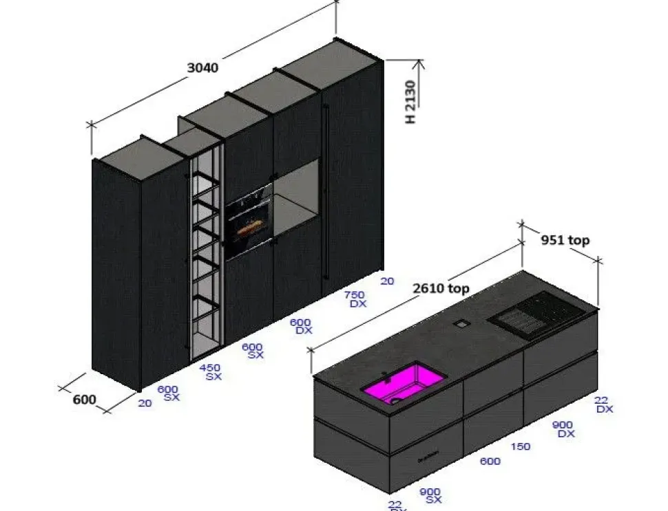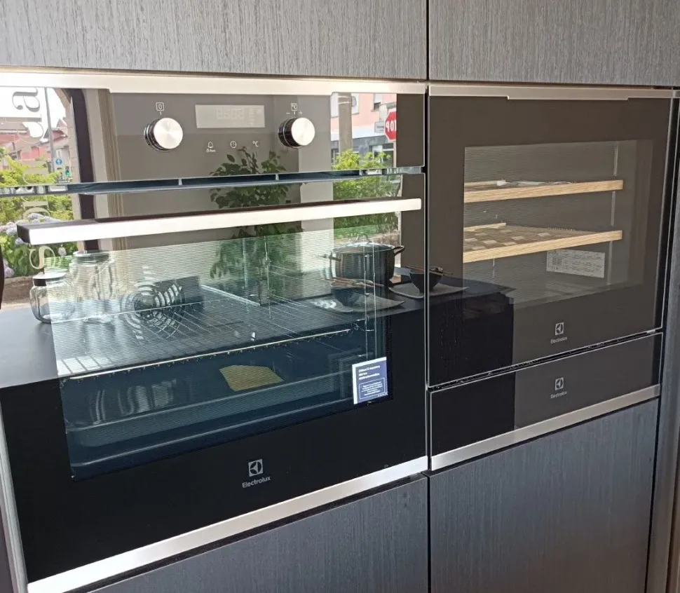 Composizione cucina con isola mod. OBLIQUA + INSPACE di Ernestomeda, completa di: parete a colonne in finitura Hi-melamine materico legno tinta CAUCASO con sistema d’apertura a push-pull e per le ante lunghe con maniglione mod. Tube in finitura JetGrey e composizione isola attrezzata con ante in finitura Fenix tinta Grigio Etna completa di top superiore in Gres Abitum tinta Metallo Black opaco finitura naturale (sul top è stato previsto un punto prese a scomparsa in finitura nera). La parete colonne, lunghezza totale 304 cm, altezza 213 cm, è così composta da sinistra: una colonna da 60 cm con anta battente e fornita internamente di cinque cestelli estraibili ad estrazione indipendente uno dall’altro, un ripiano fisso ed un ripiano fisso in vetro trasparente con struttura in metallo finitura grafite, completata da illuminazione Led verticale; una colonna vetrina da 45 cm con anta battente e ripiani interni fissi in vetro trasparente e telaio in metallo in finitura grafite e completa di illuminazione Led verticale; una colonna da 60 cm con forno e due ante battenti; una colonna da 60 cm con cantinetta, cassetto statico con frontale in vetro e due ante battenti e colonna frigocongelatore da 75 cm. La parete colonne inoltre è completata da due fianchi a terra di finitura. L’isola, dimensione totale 261 x 95,10 cm, invece è così composta: base sottolavello a due cestoni fornita di set pattumiera per raccolta differenziata; anta per lavastoviglie da 75 cm (internamente è inserita una lavastoviglie da 60 cm + un vano a giorno portadetersivi); base sotto il piano cottura a due cestoni ed un cassetto interno fornito di portaposate e tre basi retro isola con profondità ridotta a d anta battente (due basi da 90 cm ed una base da 75 cm). La cucina è completa dei seguenti elettrodomestici: lavello sottopiano Foster serie KE-R15 ad una vasca unica da 71 cm inox in finitura Gun Metal (particolare tinta inox scuro), miscelatore con doccetta estraibile Foster mod. Omega Plus in finitura Gun Metal, lavastoviglie Electrolux mod. KESC7320L, piano cottura ad induzione da 70 cm Siemens mod. EX775LEC1E, forno Electrolux mod. KOFDP60X, cantinetta vini Electrolux mod. KBW5W, cassetto statico in abbinamento a forno e cantinetta Electrolux mod. KBS4X e frigocongelatore Electrolux maxi da 70 cm mod. KNS7E75S. Vendita per rinnovo esposizione. Nella cucina non è prevista la cappa, possibilità di acquistarla a parte, offerta in base al modello scelto. TRASPORTO E MONTAGGIO ESCLUSO