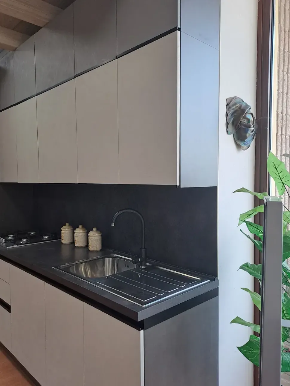 cucina lineare metri 3,63, altezza 264 cm. Doppi pensili per aumentare la capienza. Apertura senza maniglia con profilo verticale e orizzontale in metallo nero o inox. Anta in finitura cemento col. ghiaccio per colonne e fila bassa pensili, ardesia per seconda fila alta di pensili. Struttura col. antracite. Anta in mdf con profilo metallico col. nero sul bordo superiore. Top laminato spessore 4 cm col vulcanic, alzatina in tinta. Zoccolo PVC nero. Elettrodomestici marca Candy inclusi. La colonna a giorno tra le 2 colonne non è compresa. Disponibile in 9 finiture per ante, 5 colori per struttura e 20 colori per top. Possibilità di sostituire il piano cottura a gas con uno ad induzione senza maggiorazione. MISCELATORE E PORTA POSATE OMAGGIO Il trasporto è compreso nel raggio di 100 km complessivi dalla nostra sede. Non esitate a contattarci per qualsiasi informazione!