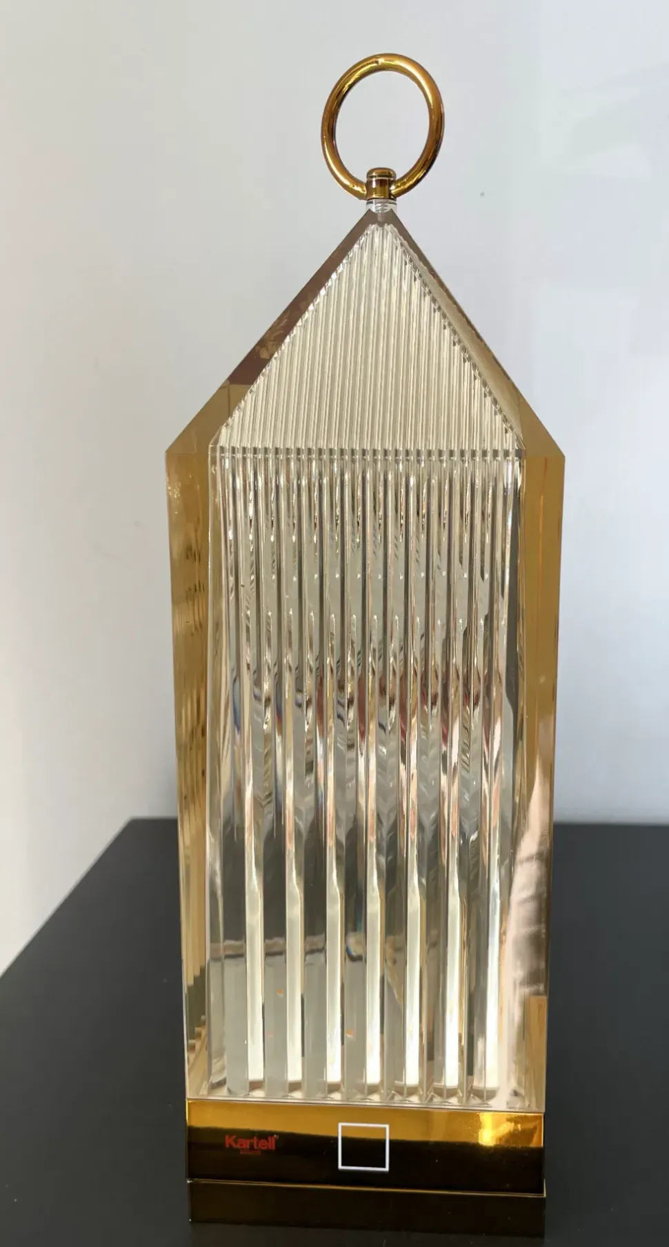 Kartell lampada Lantern, design Fabio Novembre. Lantern è un’originale lampada a led portatile, una “lanterna ricaricabile” trasparente, stampata a iniezione, che si ricarica appoggiandosi a una base conduttrice. La luce viene proiettata grazie a un effetto grafico del design.