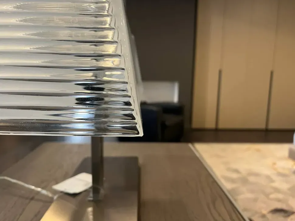 Dal soggiorno alla cucina, l’illuminazione riveste un ruolo di primaria importanza, in quanto supporta ogni gesto delle tue giornate. In giardino le lampade illuminano serate di relax oppure le vie di camminamento. La proposta qui visibile, ideale per spazi da interni, ti garantirà la totale contentezza. Visto che gli ambienti domestici devono essere organizzati con una precisa logica, in modo che gli arredi, tra cui anche l’illuminazione, organizzino al meglio lo spazio senza risultare d’intralcio, il marchio ha ideato una vasta scelta di modelli di lampade, da terra e da tavolo, a sospensione oppure paretali; il modello qui presente è uno splendido esempio di da tavolo firmata dal marchio. Confermare una precisa coerenza di stile durante la scelta dell’arredamento per la propria abitazione, quindi anche dell’illuminazione, è imprescindibile, in quanto gli ambienti domestici rispecchiano i gusti di chi li frequenta: il modello qui visibile è perfetto per completare esteticamente ambienti di stile design. Quando si vuole rendere più brioso l’arredo di casa con composizioni di eleganza e classe, si rischia di fare una scelta o troppo superficiale o troppo eccessiva. Per portare tra gli arredi di casa un tocco colorato e vivacità in perfetto equilibrio, basta scegliere una lampada arricchita da qualche dettaglio colorato ma armonioso. Il modello mostrato in foto, per esempio, appartiene alla ricca serie di lampade di colore trasparente della marca, colore sempre elegante e versatile. Le finiture valorizzano le doti di praticità ed estetica dell’arredamento, tra cui ci sono anche le lampade, per questo sono da prendere in considerazione con attenzione, seguendo le proprie aspettative: il modello qui presente è costruito in vetro di qualità eccellente e dall’estetica raffinata.