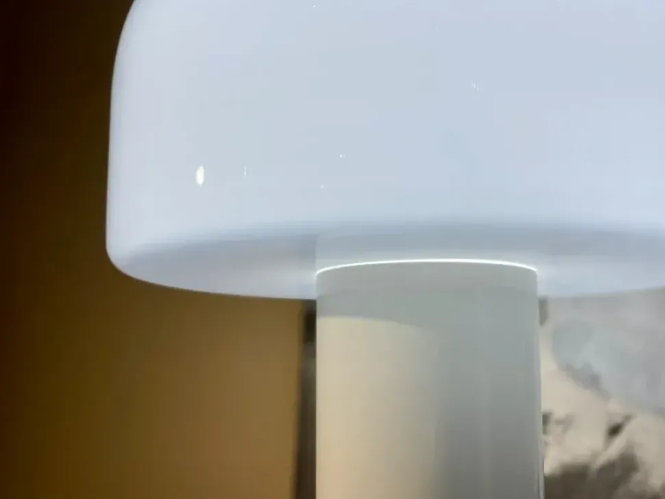 Il cuore della lampada è la sua cupola in vetro opalino triplex, realizzata con una sofisticata tecnica che prevede un sandwich di tre strati di vetro: uno strato bianco interno racchiuso tra due strati trasparenti soffiati simultaneamente. Ogni strato presenta spessori differenti, un dettaglio che rende il diffusore unico e tecnologicamente avanzato.