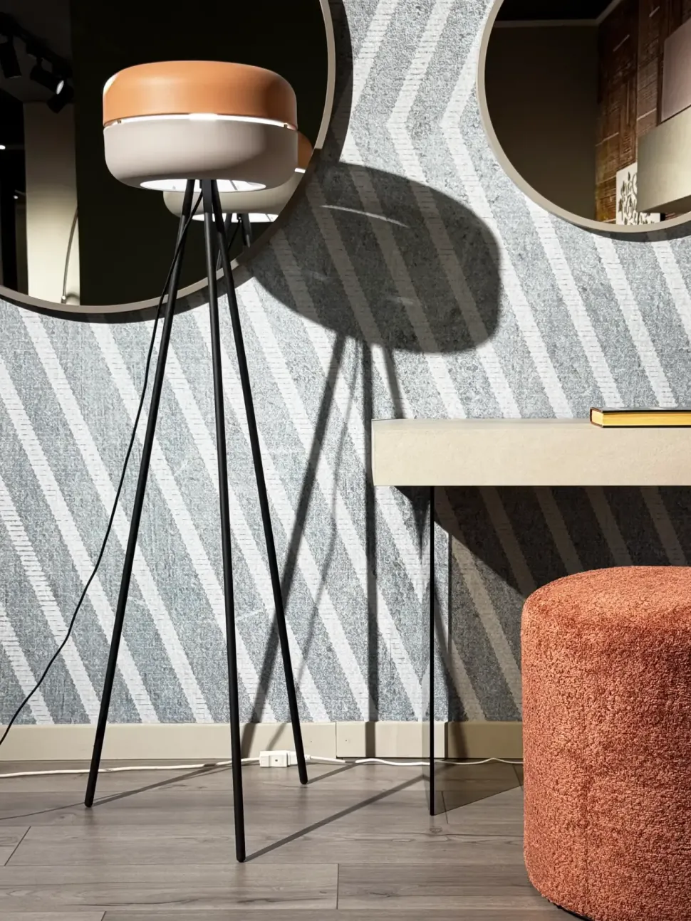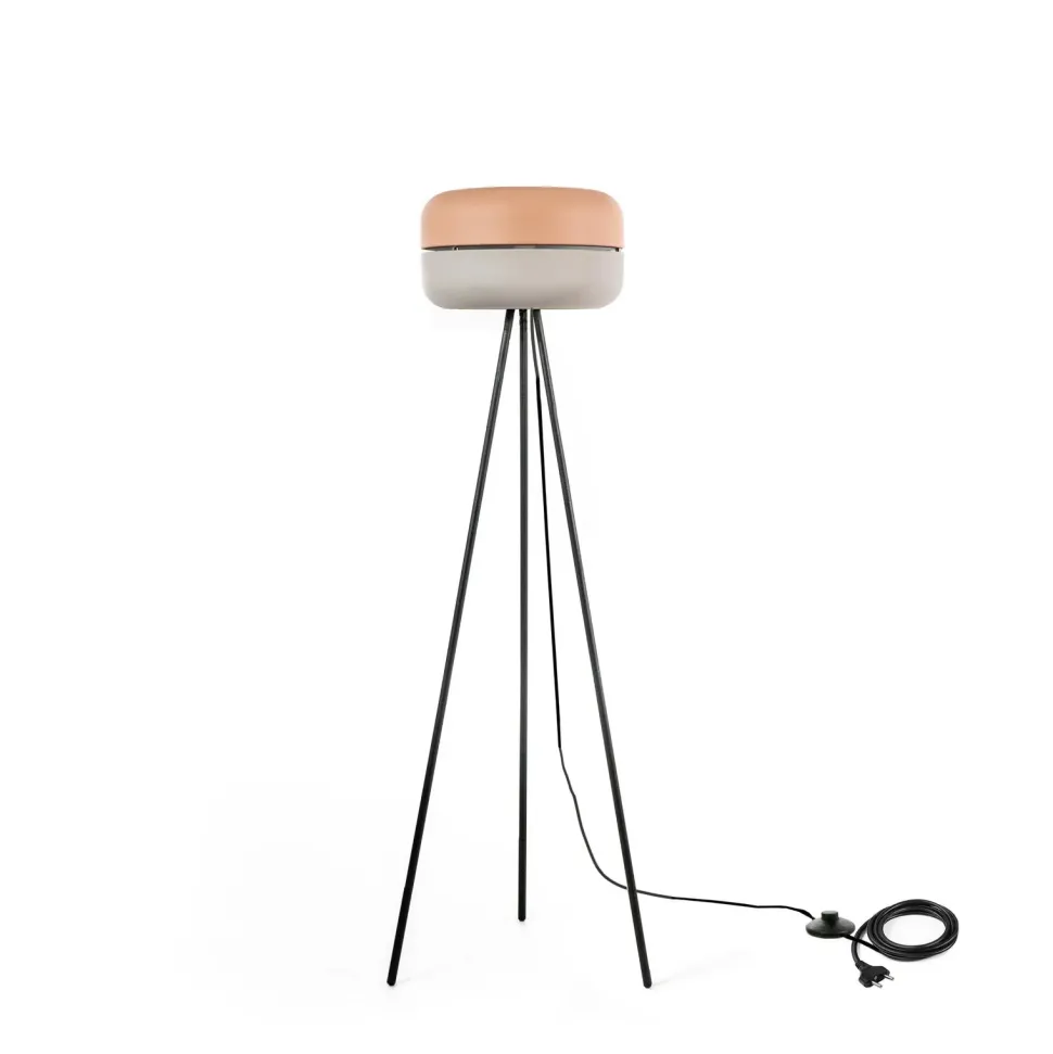 La Lampada da terra Idra ha una struttura in metallo verniciato nero, paralume in metallo verniciato rosa e grigio chiaro, cavo telato nero con interruttore a pedale. Design originale e accattivante, sarà imprenscindibile nella vostra casa. Predisposto per 1 lampadina E27 max 40W.