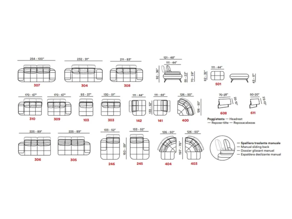 Salotto angolare composto da un divano ad un bracciolo ed angolo terminale, molto caratterizzanti sono le spalliere con meccanismo avanti – dietro manuale che aumentano la profondità del salotto di 26 cm.