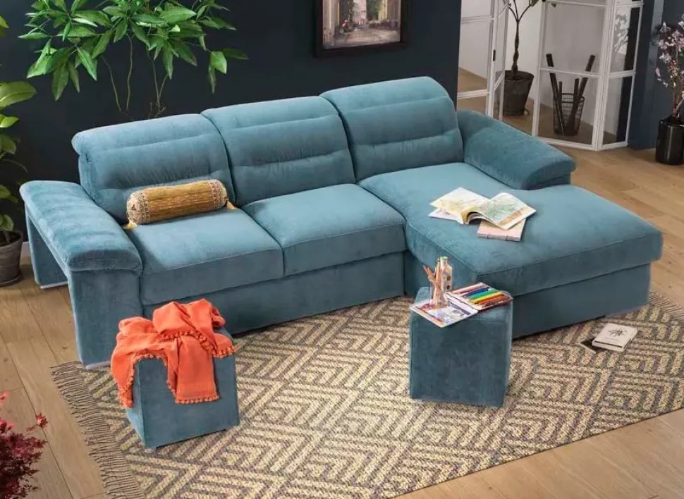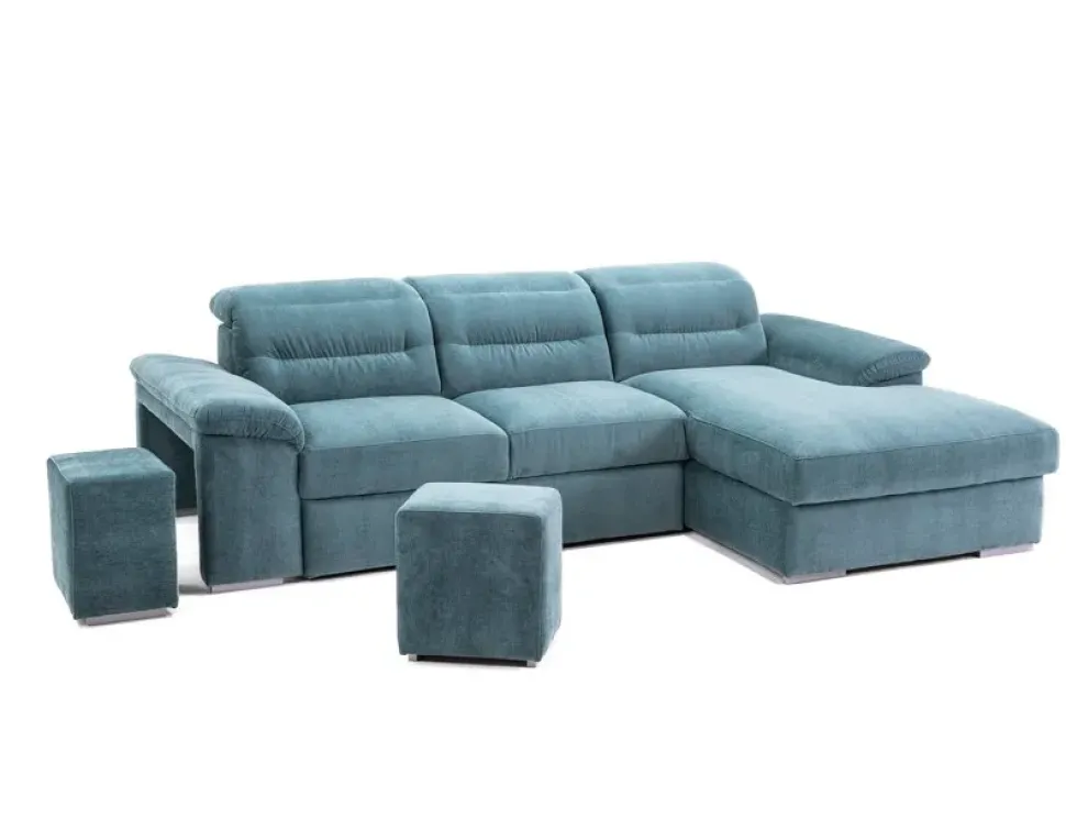 - Tipologia divani con penisola: questa proposta è totalmente imbottita in poliuretano, ideale per assicurare morbidezza e resistenza dopo anni di uso prolungato.