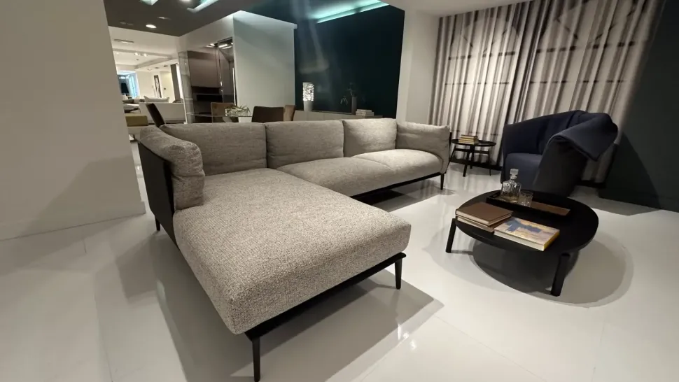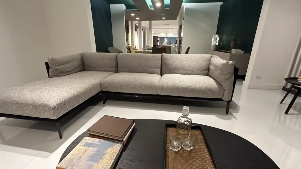 Gli arredi, tra cui anche gli imbottiti, non devono mai risultare d’ingombro, soprattutto per lo spazio che impegnano all’interno dei locali; infatti è fondamentale valutare con cura anche le loro misure: il modello di Divano con penisola presente in foto fa parte della linea di imbotti della firma di lunghezza che varia da 276 a 300 cm ed è perciò ideale per un luogo di svariate dimensioni.