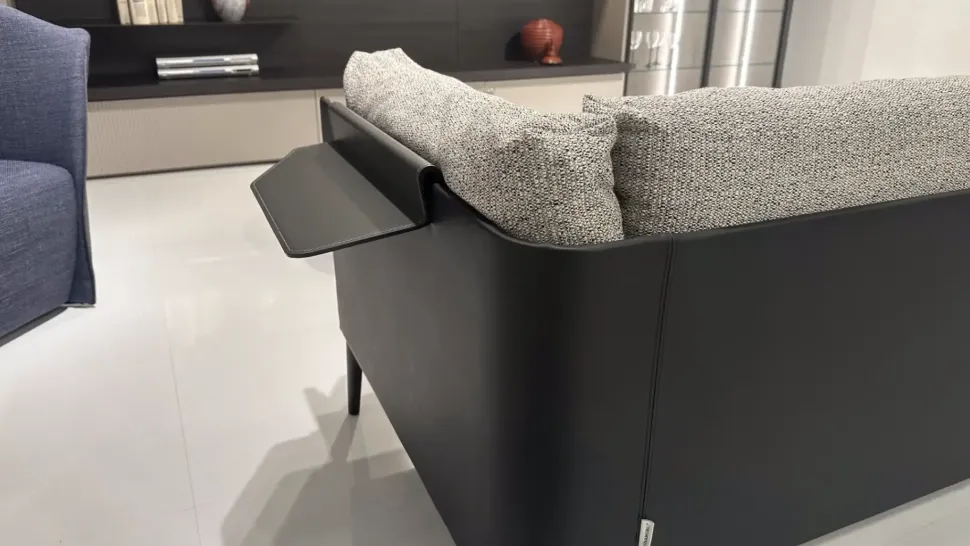 DIvano Novamobili modello Kubì misto con scocca in pelle e seduta in tessuto, con pianetto in cuoio per bracciolo.