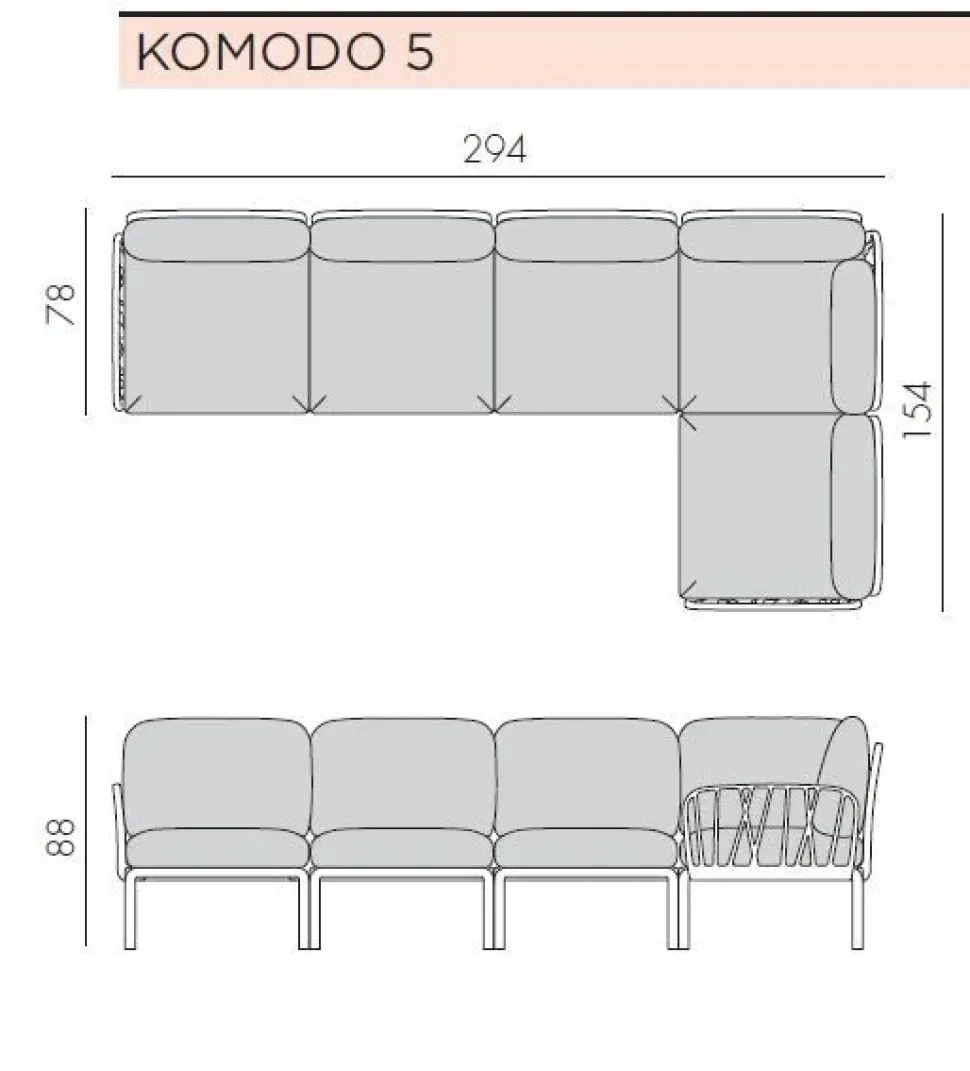 Il divano Komodo 5 è un sistema modulare di sedute combinabili in più combinazioni. Fa parte del set il tavolino Komodo in polipropilene. Struttura in polipropilene fiberglass trattato anti-UV e colorato in massa, reciclabile. Schienale e braccioli agganciabili su tutti i lati della seduta. Smontabile. Finitura opaca. Dotato di piedini antiscivolo. Kit cuscini sfoderabili per 5 posti incluso nell’imballo. Dimensioni L294 P78/154 H88.