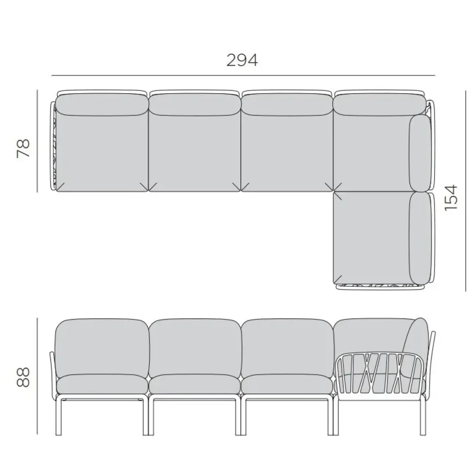 Dimensioni: Altezza 88 cm, Larghezza 294 cm, Profondità 78/154 cm