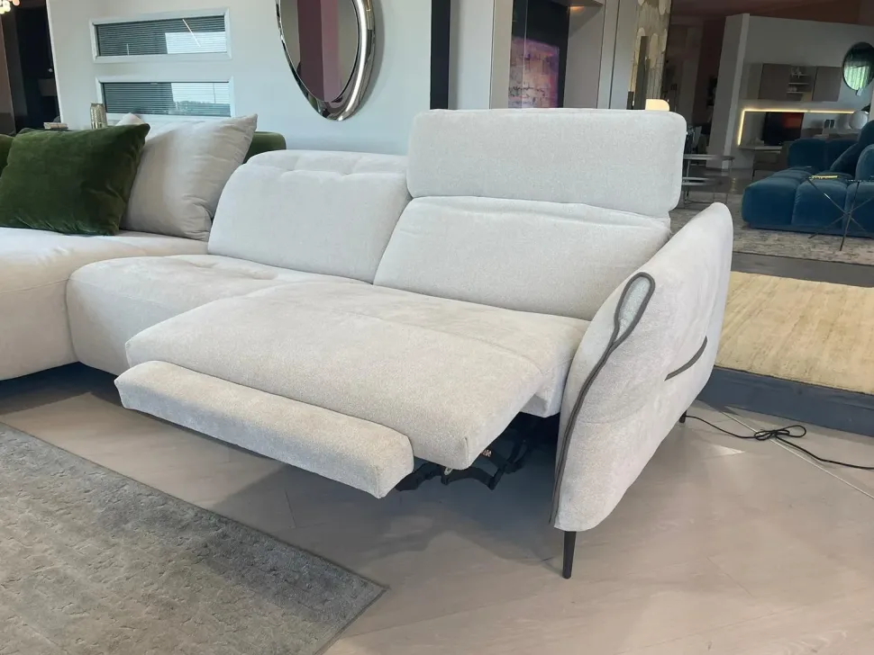 Divano con penisola semicircolare, e due sedute, una fissa e una relax elettrica. Entrambe con poggiatesta reclinabile.