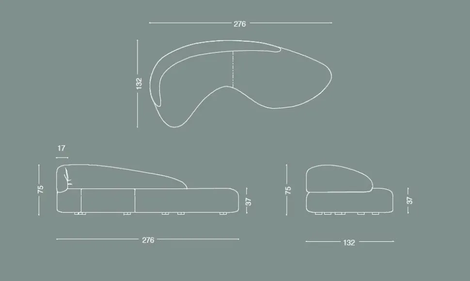 LUNGHEZZA 277 CM ALTEZZA MASSIMA 77 CM ALTEZZA DA TERRA FIN SOPRA SEDUTA 40 CM PROFONDITA 132 CM