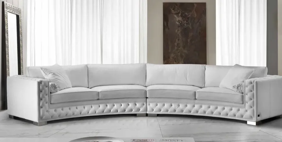 - Tipologia divani: Divano luna pelle capitonne con seduta fissa, stile classico, numero posti grandi, lunghezza grandi.