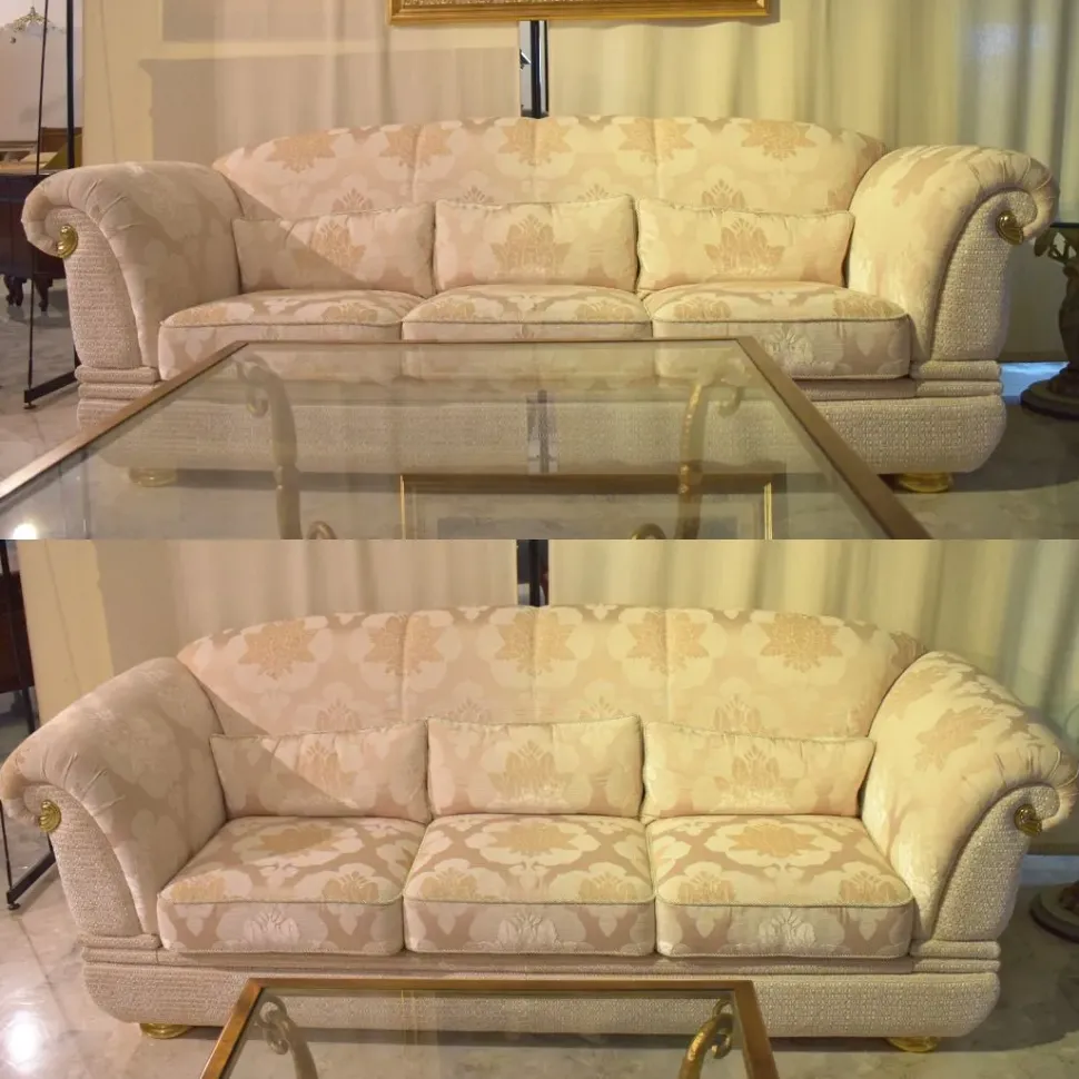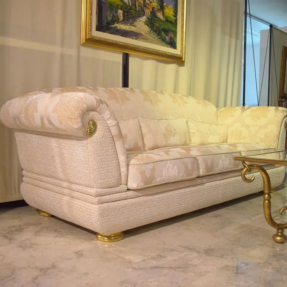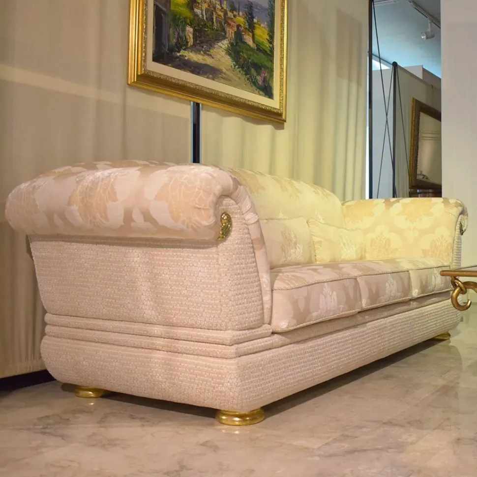 Divano Luxury ditta Turri mod. Doniss cm 242x86h.90, rivestimento in tessuto pregiato e finiture oro.
