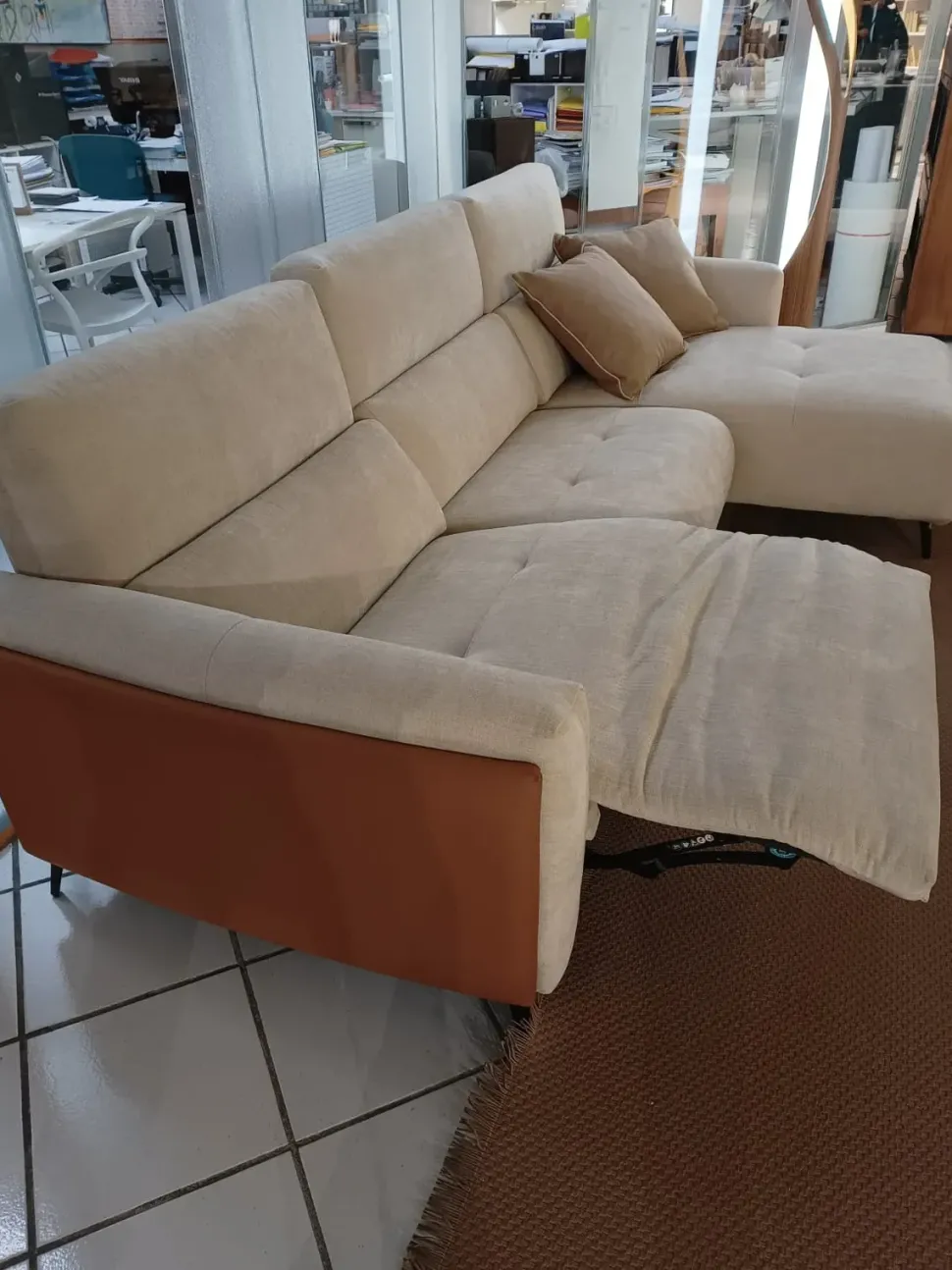La Scala è un divano che interpreta il relax con soluzioni tecnologiche avanzate e linee avvolgenti. Le forme morbide si uniscono al sistema MOTION³, che grazie ai tre motori indipendenti regola con precisione spalliera, seduta e poggiatesta. Il comfort lombare dedicato e la possibilità di personalizzare ogni posizione rendono questo modello un autentica oasi di benessere domestico. Rivestimento in tessuto ecrù con trattamento antimacchia, fianchi divano in ecopelle colore cuoio.Elemento laterale con movimento elettrico con comandi del movimento integrati nella seduta. Dimensioni divano cm 280 prof. cm 90 per la seduta e profondità cm 160 per la penisola.