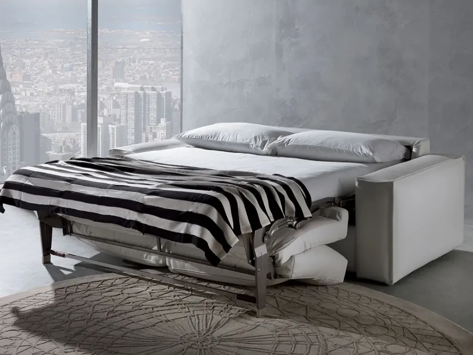 - Al fine di ottimizzare lo spazio nel living, è necessario scegliere gli arredi in base a forma e metratura degli ambienti, valutando quindi anche la tipologia di imbottito che è per te tra divani, poltrone, divani letto e tanto altro; il modello presente in foto è appartenente alla collezione di divani letto di grande qualità firmati dal marchio.
