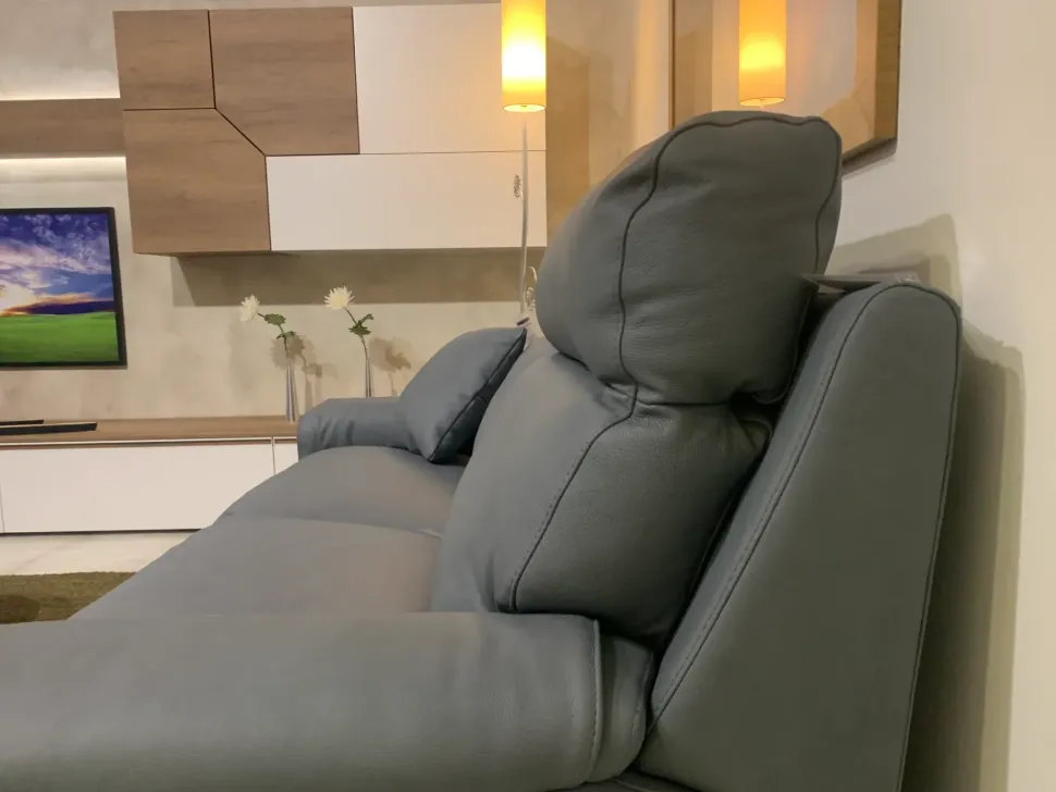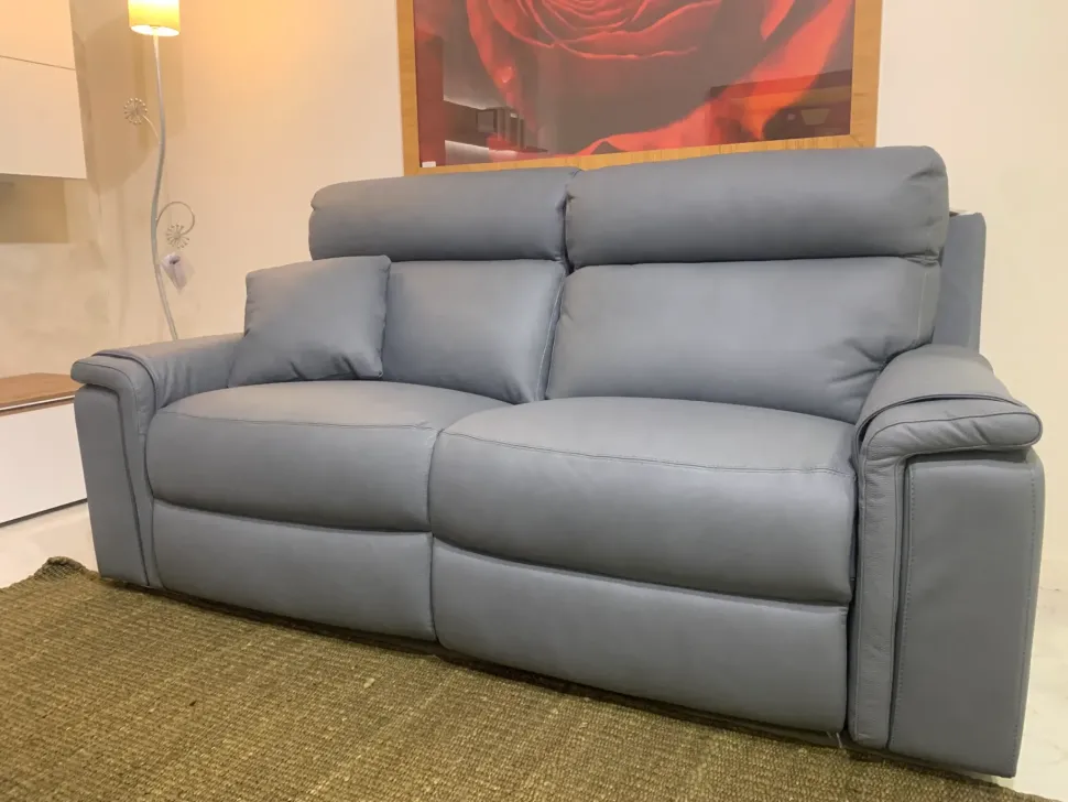 Divano 3 posti con doppio meccanismo relax elettrico gambe e poggiatesta. Rivestimento in pelle spessorata.