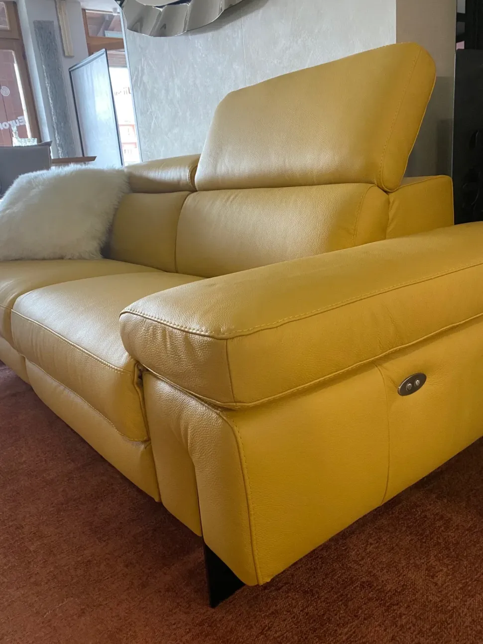 Il divano candice molto bello ed elegante, in vera pelle si adatta benissimo ad ogni ambiente. I due recliner elettrici sono molto funzionali e sono molto apprezzati da coloro che hanno bisogno di rilassarsi. Il divano è lungo 222cm. Lo schienale possiede un pratico cricchetto che si alza e si abbassa a seconda delle esigenze. Colore pelle bull giallo. in omaggio il kit di pulitura pelle.
