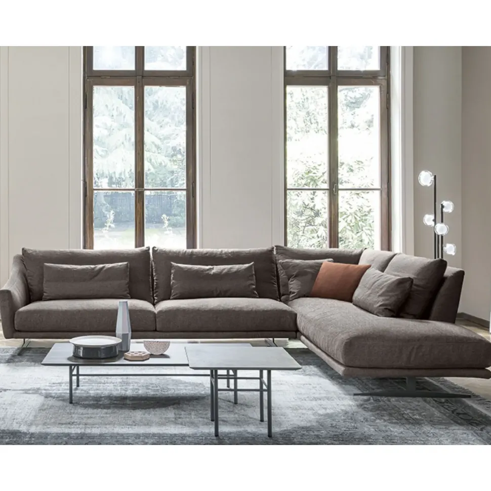 - Braccioli inclinati e piedini in metallo che sollevano il divano da terra, creando un effetto leggero e moderno.