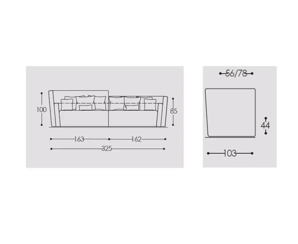 LUNGHEZZA TOTALE 325 CM PROFONDITA SEDUTA 100 CM MISURE TECNICHE IN FOTO