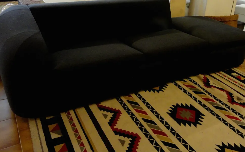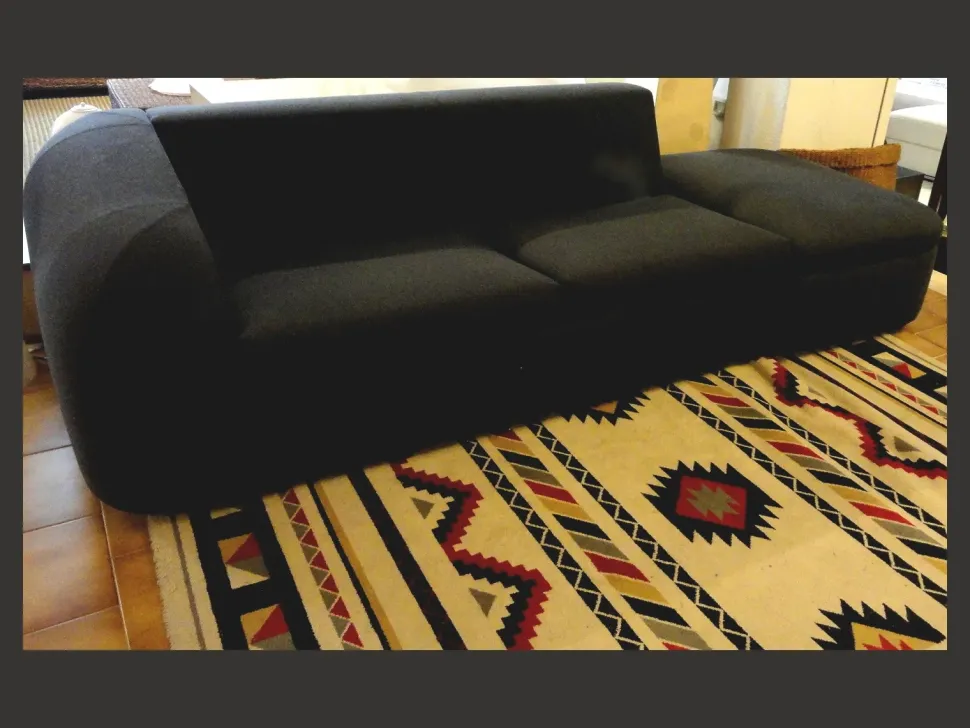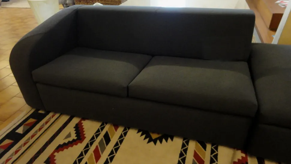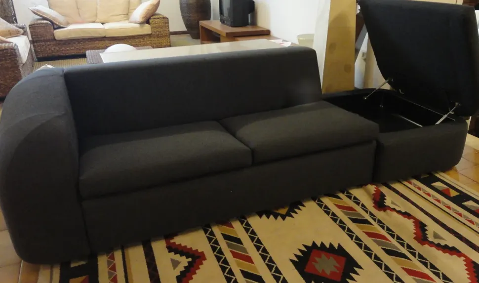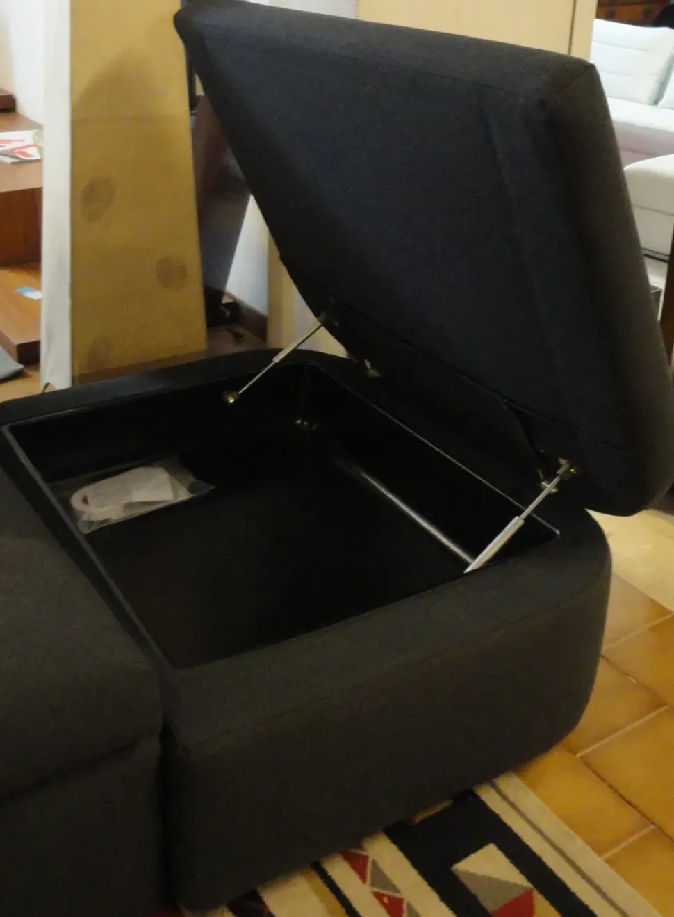 Il divano è interamente sfoderabile ed è completo di pouf a forma di semicerchio a contenitore con apertura nella parte superiore.