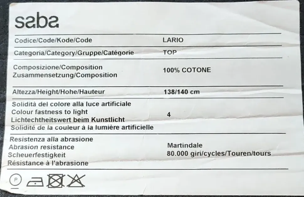 Il rivestimento utilizzato è un Velluto in 100% cotone, il colore scelto è il 1011 della categoria Lario