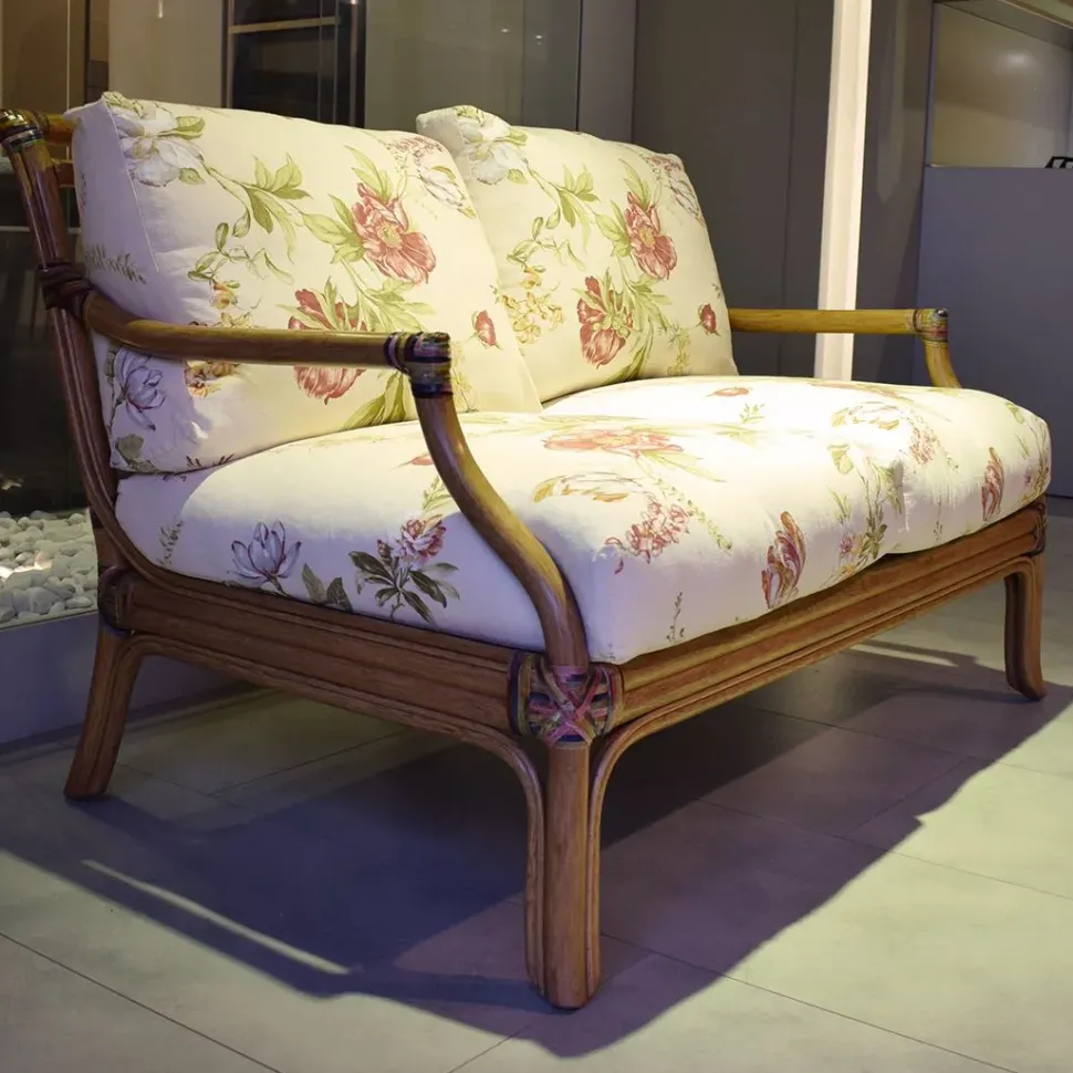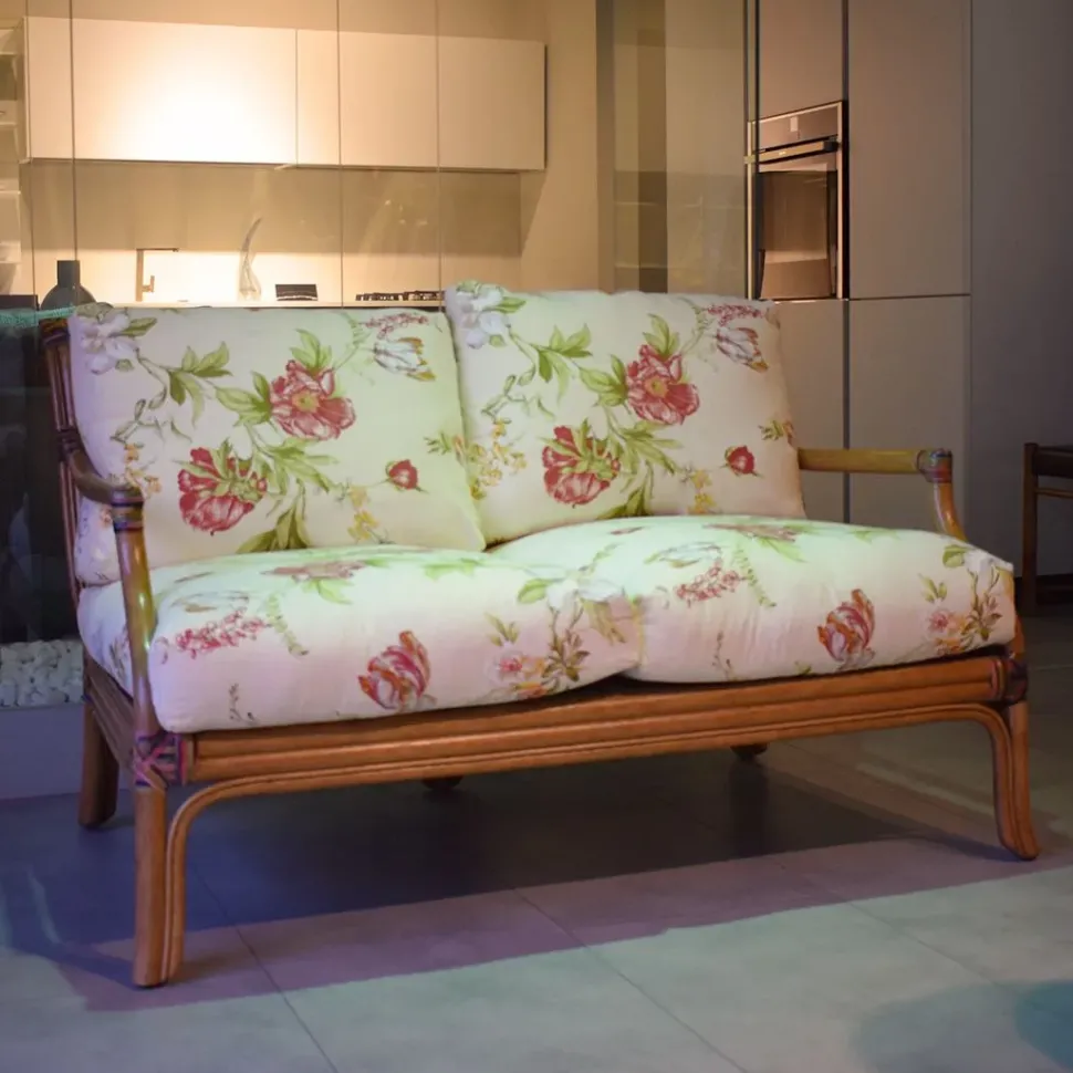 Divano 2 posti ditta Dolcefarniente in rattan naturale intrecciato a mano, rivestito in tessuto. Alla base di ogni creazione c è l arte dell intreccio. Con i suoi disegni e le sue trame affascinanti, l intreccio trasmette emozioni uniche che sono il risultato di lunghi processi e meticolosa maestria. La produzione fatta a mano unita ad un accurata selezione dei tessuti, esalta l unicità di ogni pezzo, rendendolo distinguibile dalle imitazioni, come tutti i prodotti di natura artistica fatti con estrema precisione. Dimensioni l.133 p. 90 h. 80.