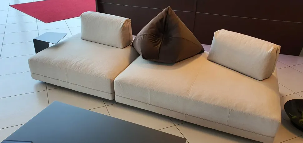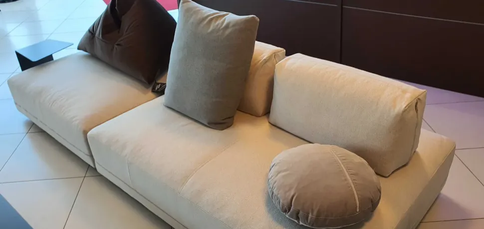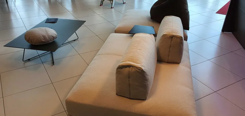 Le sedute sono dei grossi pouff spostabili e girevoli che possono essere configurati a piacimento per ottenere una composizione angolare, lineare, con penisola oppure un’unica e grande isola grazie alle dimensioni generose degli stessi. Gli schienali invece sono dei cuscini zavorrati che possono essere posizionati in funzione della situazione ovvero come schienali, come braccioli oppure come divisori.