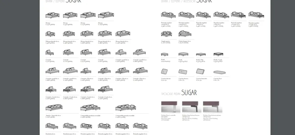 - Rendere bello il tuo soggiorno in modo che sia totalmente funzionale sarà semplice grazie ad uno dei modelli di divani come questo: se desideri stare a tuo agio tutti i giorni in uno spazio prettamente destinato al relax, scegli il modello Sugar qui disponibile, ideale per avvolgerti e coccolarti con la sua soffice imbottitura.
