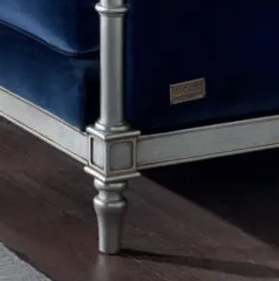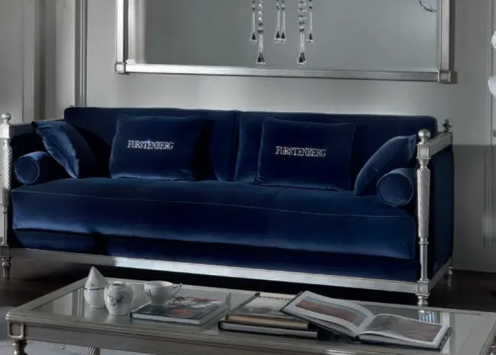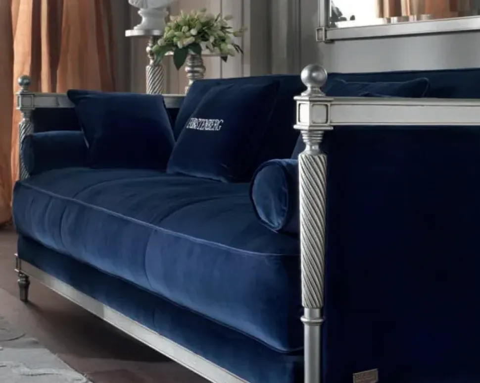 La struttura è a vista di color argento ed impreziositi con intagli che rendono ancor di più elegante e lussuoso questo divano.