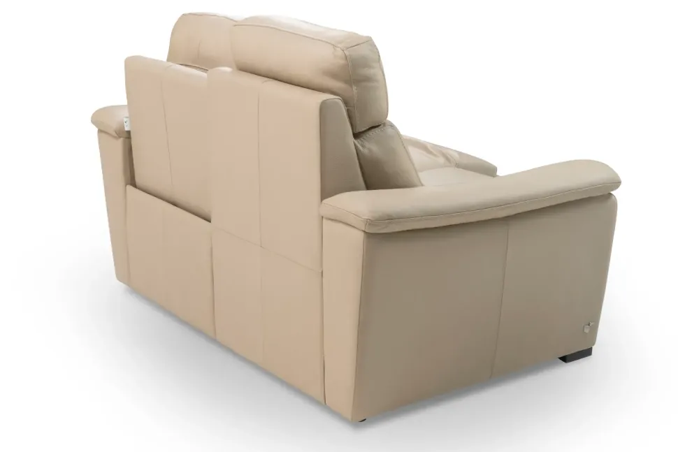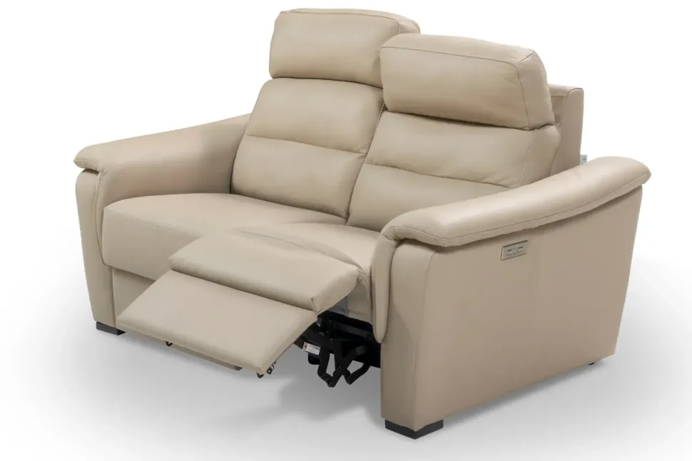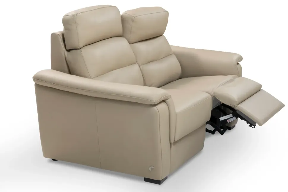 E’ rivestito in vera pelle De Luxe nel colore fango- L’imbottitura è in poliuretano espanso ecologico e la spalliera è imbottita in fiocco. Una delle due sedute è reclinabile mediante meccanismo metallico motorizzato attraverso un pulsante posto nel fianco esterno. La profondità del modello con meccanismo reclinabile aperto è di cm 153.