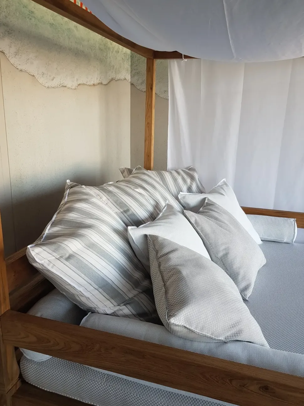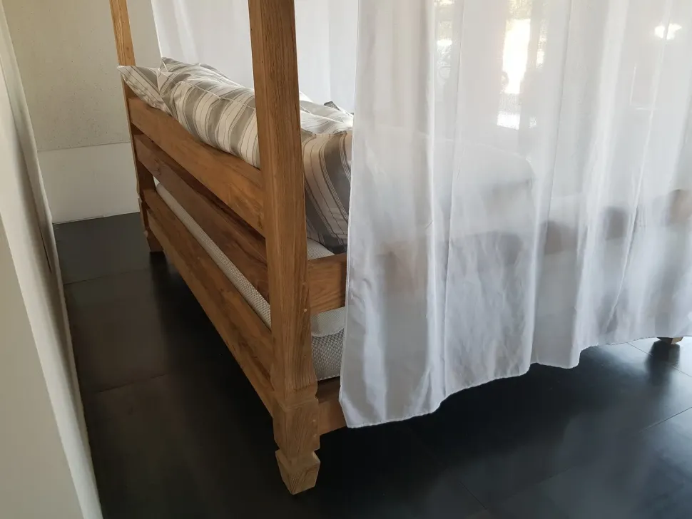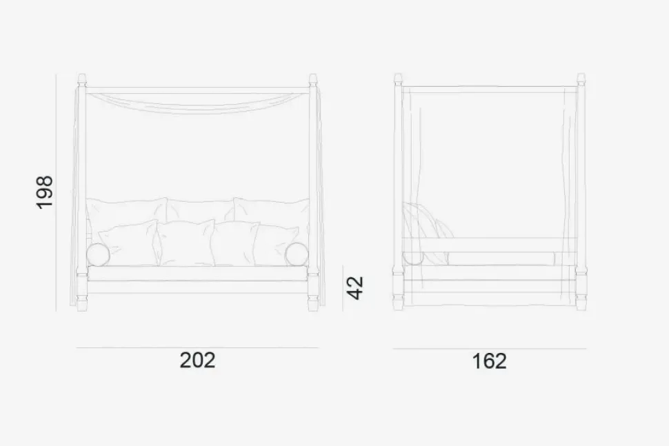 Jeko è un maestoso divano a baldacchino realizzato in ECOteak, legno che proviene dal riutilizzo di travi ed elementi in teak recuperati dalla demolizione delle tradizionali case di legno dell’isola di Giava, Indonesia. Gli elementi ricavati vengono tagliati a misura, assemblati e levigati per evidenziare le venature originali. L’imbottitura di divano e cuscini è realizzata in poliuretano e rivestita con materiale impermeabile, adatto all’utilizzo esterno.