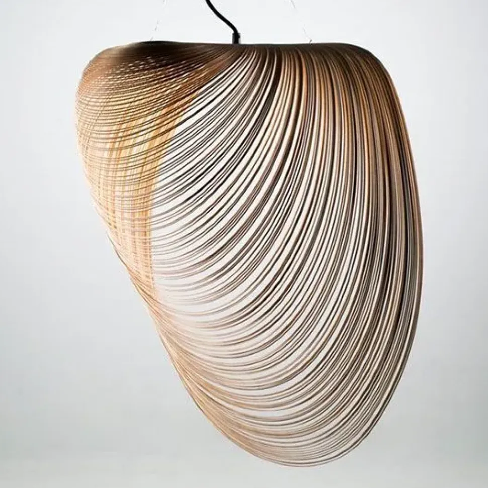 La lampada è costituita da un corpo molto leggero, ottenuto da un multistrato in legno, estremamente sottile e flessibile, tagliato al laser secondo linee fitte ed equidistanti. Il legno è un materiale prezioso e mutevole la cui unicità è riscontrabile in lievi disomogeneità di colore e di forma e nella presenza delle tipiche venature dell’essenza. Queste caratteristiche sono tratti distintivi del prodotto. Una volta sospesa al soffitto, Illan acquisisce un volume per effetto della gravità e assume la sua caratteristica forma che fluttua nell’aria.