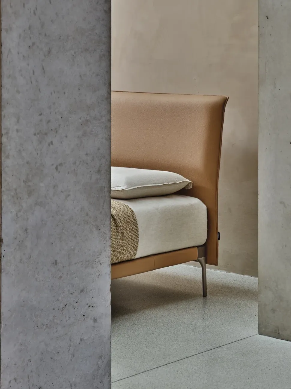 Gli spessori sottili della testiera lo rendono poco ingombrante, per questo adatto ad una residenza contemporanea caratterizzata da spazi mutevoli e versatili.