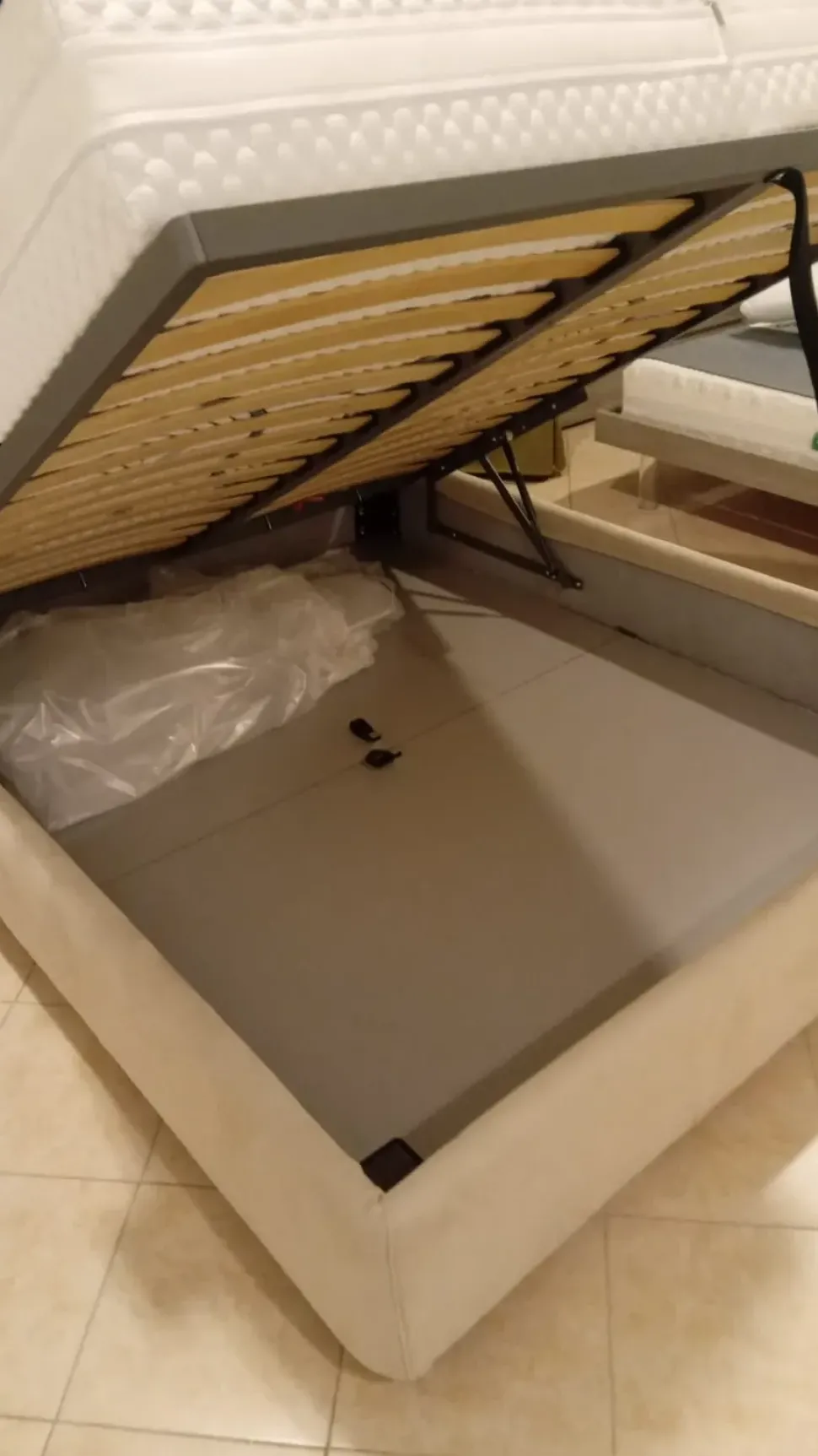 Una nostra proposta letto matrimoniale modello Allen versione in tessuto antimacchia idrorepellente con il box contenitore, rete a doghe compresa con dimensioni 160 x 195 cm, i piedini in legno haltezza 6 cm. Scontato del 40 Euro 1.200, 00 consegna compresa.