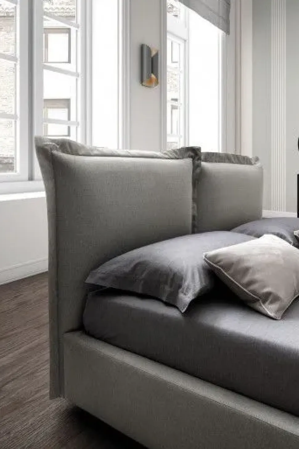 Letto dotato di funzionale base-contenitore, Catlin eccelle nel raffinato e sapiente uso delle cuciture le quali, delimitando la base di ariosi volant, operano da autentiche artiste, abili nel trasformare l’uniforme aspetto della tradizionale testiera imbottita in una romantica ed insolita coppia di ampi e soffici cuscini.