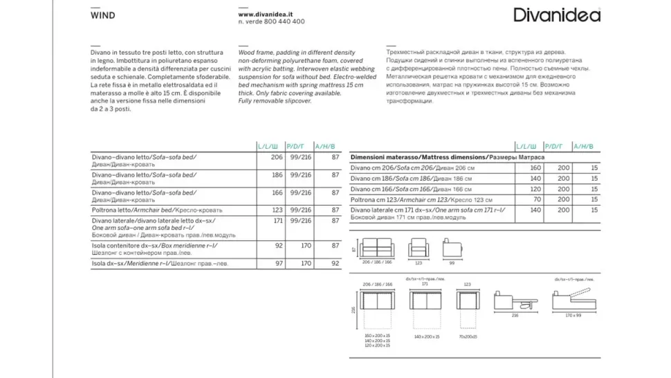 Divano con struttura in legno. Imbottitura in poliuretano espanso indeformabile a densità differenziata per cuscini seduta e schienale. Rivestimento in tessuto completamente sfoderabile. La rete fissa è in metallo elettrosaldata ed il materasso in poliuretano è alto 12 cm.
