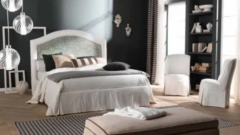 La testata curva con cornice in tessuto imbottita caratterizzata da un disegno nella parte centrale (motivo damascato).