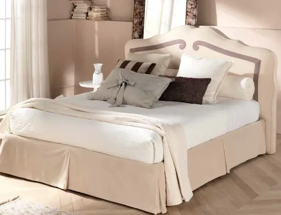 La testata dalle linee sinuose dona a questo letto armoniosità ed eleganza, caratterizzato da un disegno in rilievo nel tessuto.