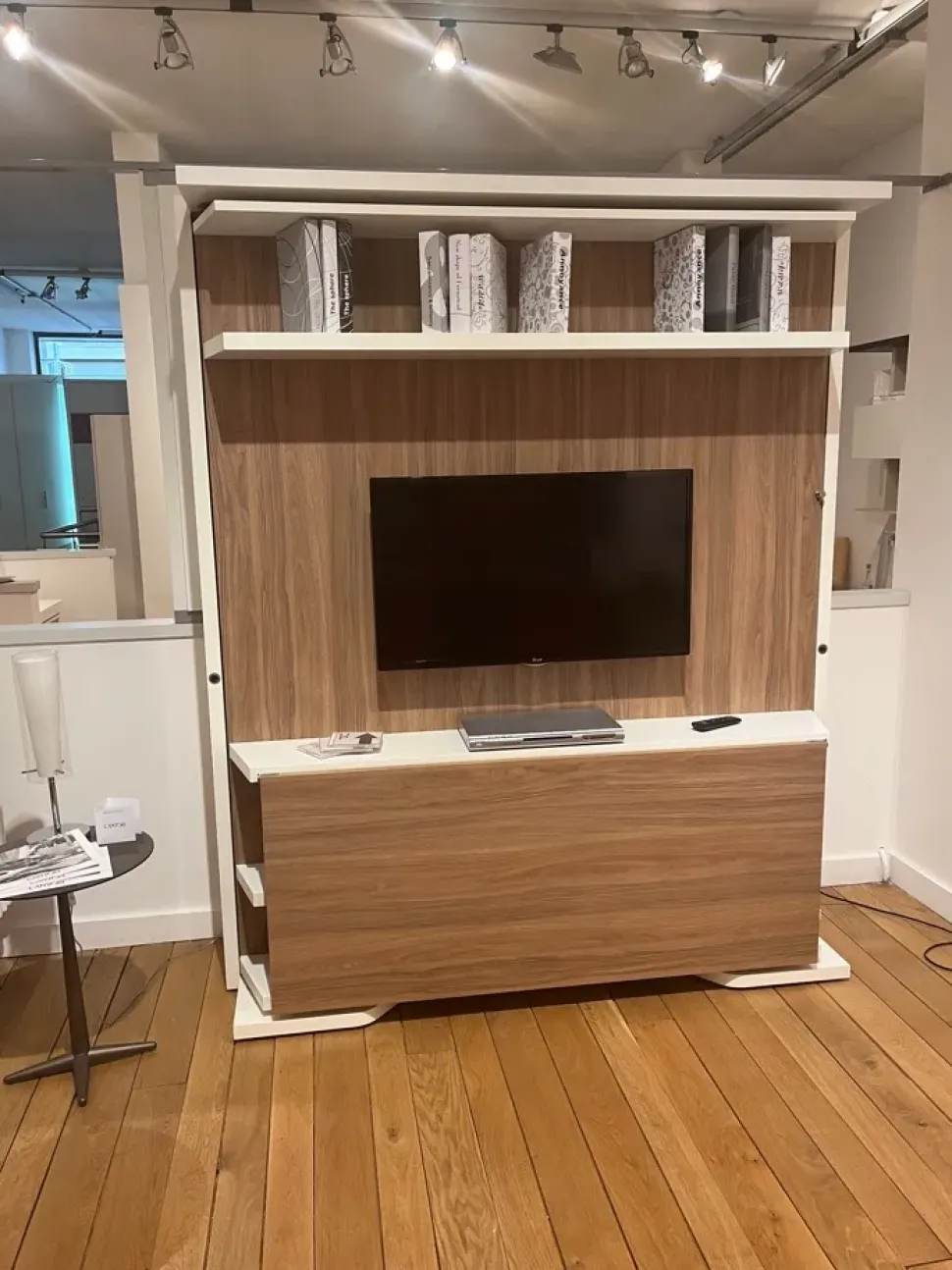 LETTO MATRIMONIALE GIREVOLE A SCOMPARSA , PROVVISTO DI CABLAGGIO PER PORTA TV , LIBRERIA , TAVOLO CON FUNZIONE SCRIVANIA O TAVOLO DA PRANZO .