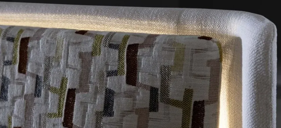 Illumina è un letto che rappresenta una vera e propria innovazione in termini di comfort e design. I laterali curvi regalano una sensazione di protezione, unita al comfort della testiera imbottita. La caratteristica di questo letto è che si illumina con il sistema LED a touch integrato nel perimetro della testiera che permette di creare una calda atmosfera con un semplice tocco.