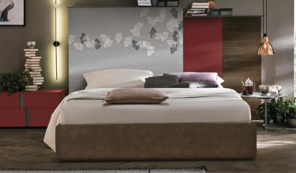 E’ una composizione che comprende 3 pannelli boiserie KREA in finitura Grafica Foglie 407, laccato opaco Bordeaux e Materico Nodato Scuro con mensole in finitura Peltro. Il giro letto SOMMIER è in Econabuk dotato di contenitore e rete a doghe. A lato è presente il comodino modello Athena L.cm 88.2 P.cm 40 H.cm 42.7 laccato Bordeaux con fondello Mosaico Brown. E’ possibile personalizzare i vari elementi con tutte le finiture del campionario previo richiesta di preventivo.