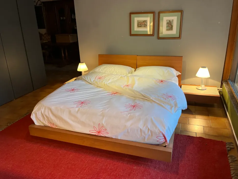 Letto matrimoniale con comodini inseriti a sbalzo in teak . Cassetti in teak con piano in vetro retro laccato . Testiera del letto posizionabile in due posizioni . Rete a doghe totalmente in legno .