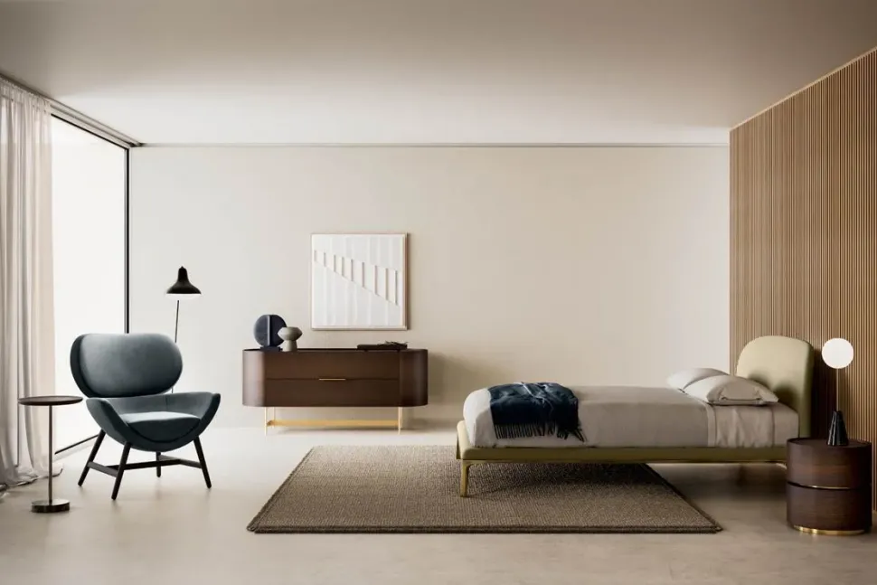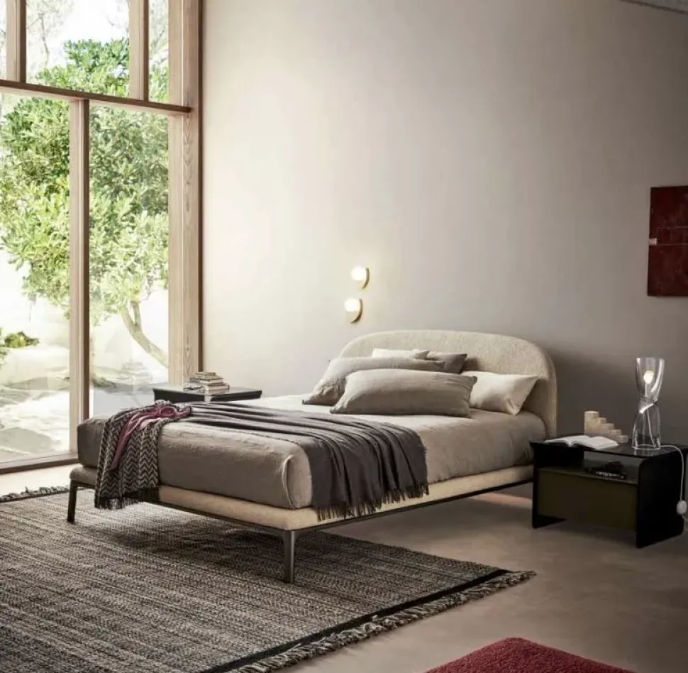 - Tipologia letto con piedini: I piedini del letto Rada conferiscono un aspetto leggero e sospeso, creando un effetto visivo piacevole e dando un tocco di originalità all’arredamento della stanza.