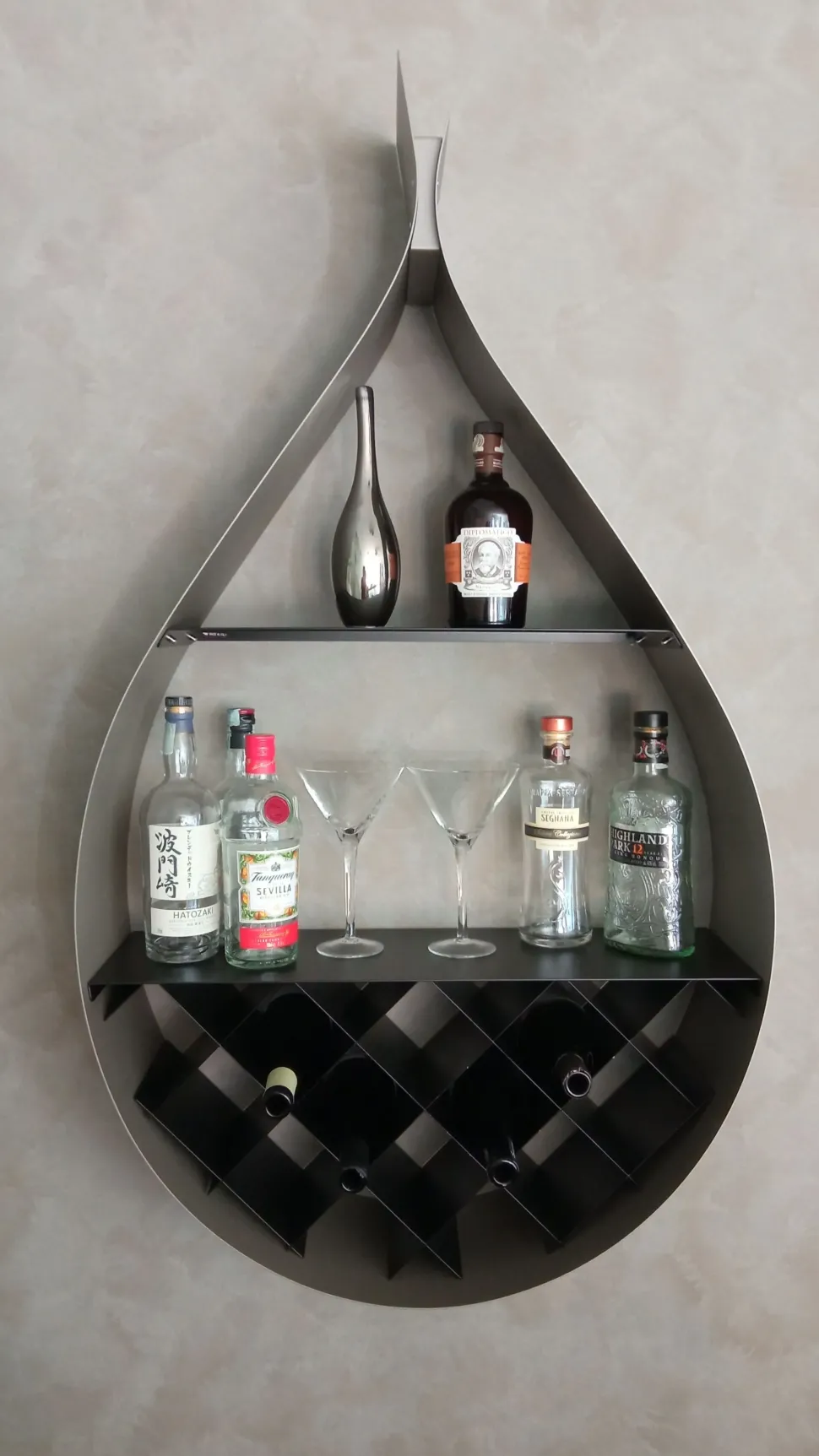 Libreria/portabottiglie a muro in acciaio verniciato goffrato titanio (GFM11) con griglia e ripiano verniciati nero (OP17) opaco.